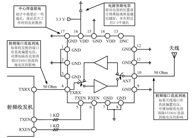 AT2401C是一款面向Zigbee,無線傳感網(wǎng)絡(luò)以及其他2.4GHz頻段無線系統(tǒng)的全集成射頻功能的射頻前端單芯片。AT2401C是采用CMOS 工藝實現(xiàn)的單芯片器件,其內(nèi)部集成了功率放大器(PA),低噪聲放大器(LNA),芯片收發(fā)開關(guān)控制電路,輸入輸出匹配電路以及諧波濾波電路。