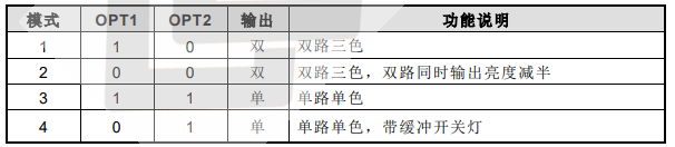 ● 共有 4 種模式可選,由 OPT1/OPT2 管腳上電前的輸入狀態(tài)來決定。芯片管腳有內(nèi)部
