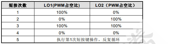 • 第 1 次短按,LO1 輸出,PWM 占空比 100%,進(jìn)入工作狀態(tài)