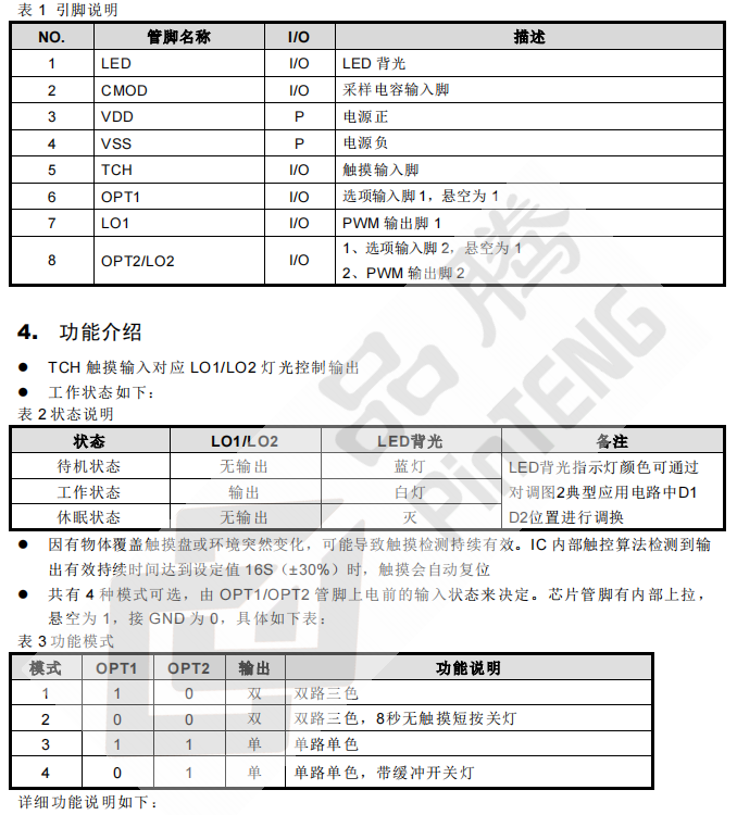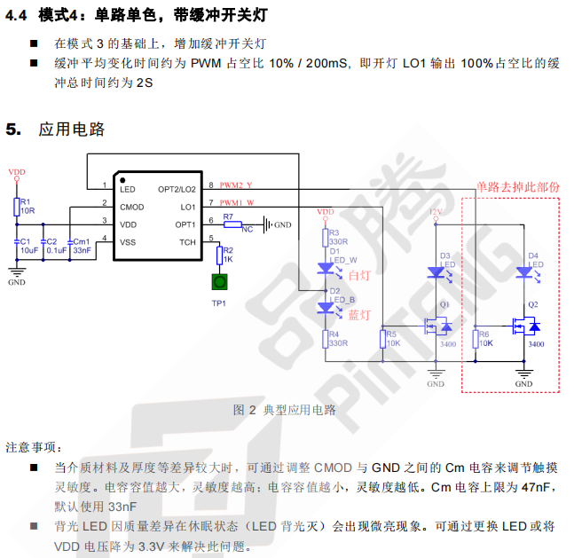 產(chǎn)片介紹: PT2027 是一款單鍵電容式觸摸控制 ASIC,支持單通道觸摸輸入和單路 雙路 PWM 輸出,可引腳配置 4 種模式。主要應(yīng)用于觸摸衛(wèi)浴鏡開關(guān)盒,具有介質(zhì)自適應(yīng)、高抗干擾、寬工作電壓范圍、燈光無頻閃、外圍器件少的突出優(yōu)勢。