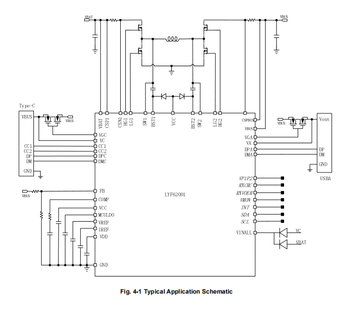 LYF62001 is a high efficiency, synchronous bi-directional buck-boost charger with integrated fast charge protocols. It is a comprehensive and flexible buck-boost chargerplatform designed for most of fast charging applicationswith type-C port and PD protocol. It can be programmedtobuck charging, boost charging or buck-boost charging. LYF62001 provides I2C interface to communicatewithMCU, provides high voltage sensing for battery andBUSterminals, accurate rail-rail current sensing for batterycurrent, BUS current and USB ports currents. It alsoprovides high voltage blocking for CC1, CC2, DP, DMcommunication signals for all of the USB ports. LYF62001can work with a general MCU to provide a complete, powerful and flexible buck-boost charging systemfor all kinds of fast charge application such as power bank, battery packs, or portable energy cubic etc.