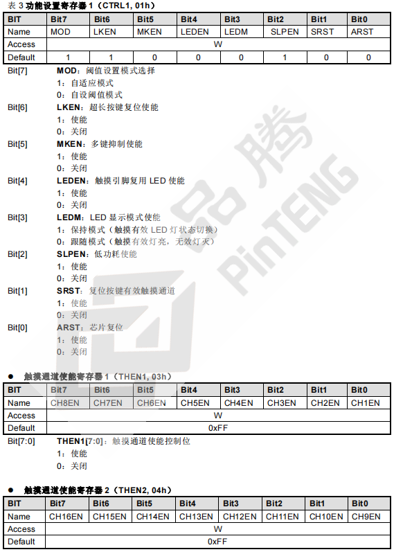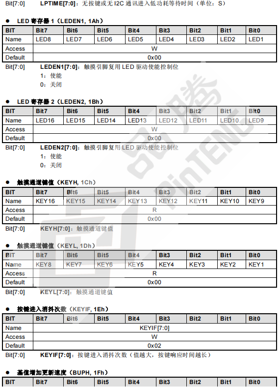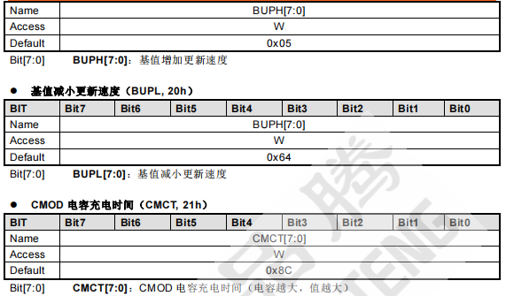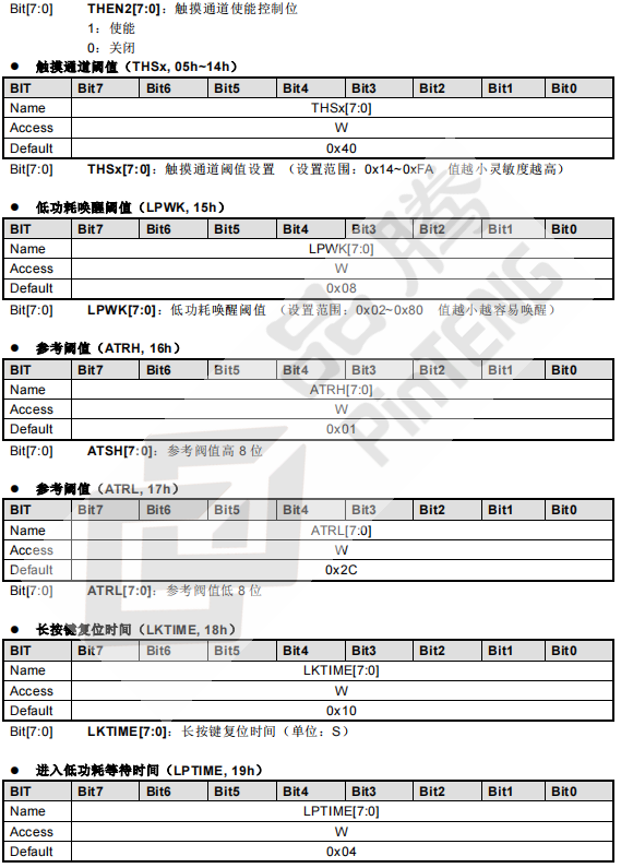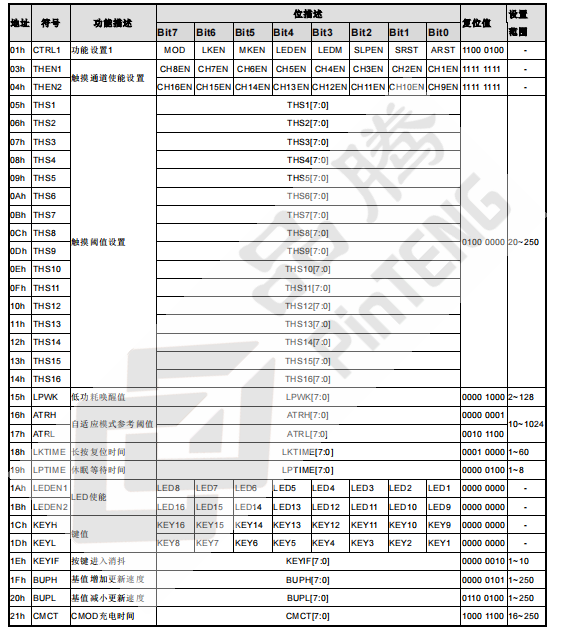 超長按鍵復位: 按鍵有效超過 16S,所有使能的觸摸通道復位