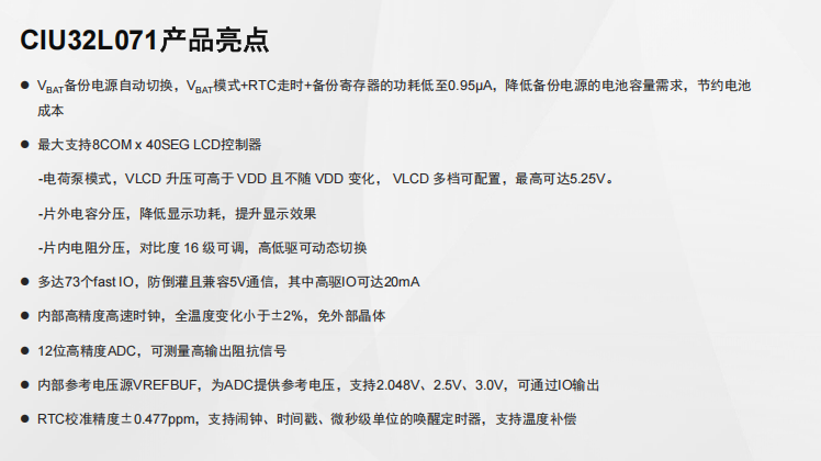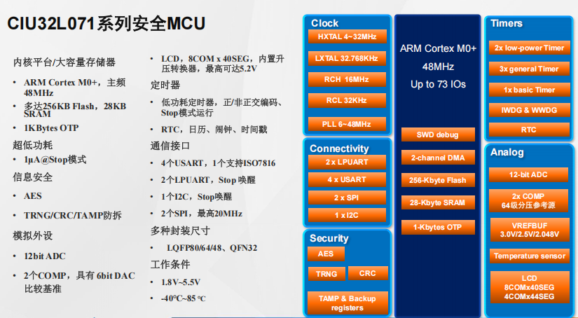產片介紹:內核平臺 大容量存儲器·ARM Cortex M0+,主頻48MHz多達256KB FIash,28KB SRAM1KBytes OTP超低功耗1uA@Stop模式 信息安全·AES TRNG CRC TAMP防拆 模擬外設 12bitADC 2個COMP,具有6bitDAC 比較基準 LCD,8COMx40SEG,內置升壓轉換器,最高可達5 2V 定時器 低功耗定時器,正 非正交編碼、 Stop模式運行 · RTC,日歷、鬧鐘