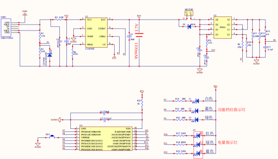 一節(jié)鋰電池供電、六個指示燈 、一個按鍵、 一個馬達(dá)控制輸出、 一路馬達(dá)電壓檢測、 一路馬達(dá)電流檢測、 充電管理。