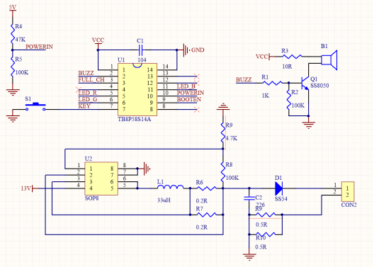 此款由一個按鍵控制、帶無線充電功能,超聲波霧化功能產(chǎn)品方案,主控芯片采用TB8P58S14A系列芯片,SOP封裝型號是14引腳,該芯片2Kx14 位的程序存儲器空間,內(nèi)建高精度十一加一通道 12 位ADC模數(shù)轉換器,與高精度電壓比較器,足以應付各種模擬接口的偵測與量測,有四組定時器,可用系統(tǒng)時鐘當作一般的計時應用或者從外部訊號觸發(fā)來計數(shù)。另外它提供 4 組 10 位的 PWM 輸出,3 組蜂鳴器輸出,可用來驅(qū)動馬達、LED、或蜂鳴器等,可選擇多種工作模式如正常模式(Normal)、慢速模式(Slow mode)、待機模式(Standby mode)與睡 眠模式(Halt mode),可節(jié)省電力消耗,延長電池壽命。通過精心設計的電路,可以實現(xiàn)如下功能: