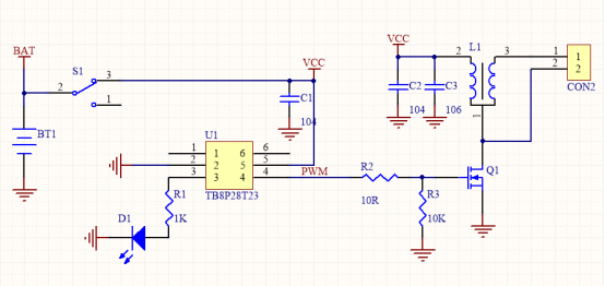 此款主要為超聲波霧化功能產(chǎn)品方案,主控芯片采用TB8P28T23系列芯片,SOP封裝型號(hào)6引腳,該芯片1Kx14 位的程序存儲(chǔ)器空間,內(nèi)建 11 階準(zhǔn)確的低電壓偵測電路(LVD),有兩組計(jì)時(shí)器,可用系統(tǒng)頻率當(dāng)作一般的計(jì)時(shí)的應(yīng)用或者從外部訊號(hào)觸發(fā)來計(jì)數(shù)。提供 1 組 8 位元解析度的PWM輸出或者蜂鳴器輸出,可用來驅(qū)動(dòng)馬達(dá)、LED、或蜂鳴器等等可選擇多種工作模式如正常模式(Normal)、慢速模式(Slow mode)、待機(jī)模式(Standby mode)與睡 眠模式(Halt mode),可節(jié)省電力消耗,延長電池壽命。通過精心設(shè)計(jì)的電路,可以實(shí)現(xiàn)如下功能: