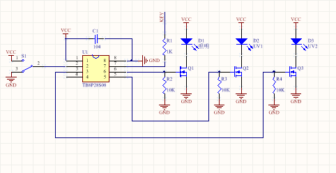 模式二(撥動(dòng)開關(guān)SW打到B點(diǎn)時(shí),即芯片2腳接GND):功能說(shuō)明:當(dāng)觸摸一下觸摸感應(yīng)模塊輸出翻轉(zhuǎn)電平給到7腳,3腳輸出點(diǎn)亮UVCLED2,當(dāng)再次觸摸一下觸摸感應(yīng)模塊輸出翻轉(zhuǎn)電平到7腳,3腳關(guān)閉UVCLED2。在點(diǎn)亮UVCLED2過程中如果沒有再次觸摸感應(yīng)模塊時(shí),殺菌15分鐘后自動(dòng)關(guān)閉。照此循環(huán)。