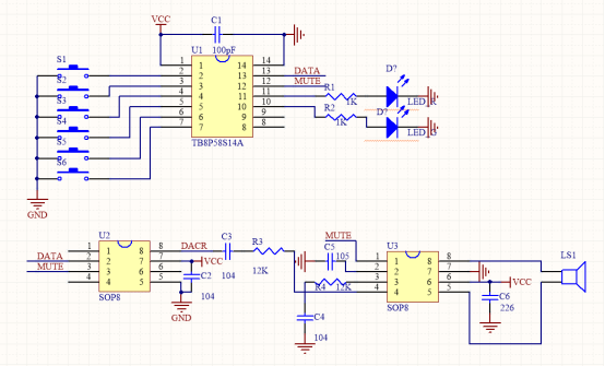 此款是觸點,指示燈、語音播放功能產品方案,主控芯片采用TB8P58S14A系列芯片,SOP封裝型號是14引腳,該芯片2Kx14 位的程序存儲器空間,內建高精度十一加一通道 12 位ADC模數(shù)轉換器,與高精度電壓比較器,足以應付各種模擬接口的偵測與量測,有四組定時器,可用系統(tǒng)時鐘當作一般的計時應用或者從外部訊號觸發(fā)來計數(shù)。另外它提供 4 組 10 位的 PWM 輸出,3 組蜂鳴器輸出,可用來驅動馬達、LED、或蜂鳴器等,可選擇多種工作模式如正常模式(Normal)、慢速模式(Slow mode)、待機模式(Standby mode)與睡 眠模式(Halt mode),可節(jié)省電力消耗,延長電池壽命。
