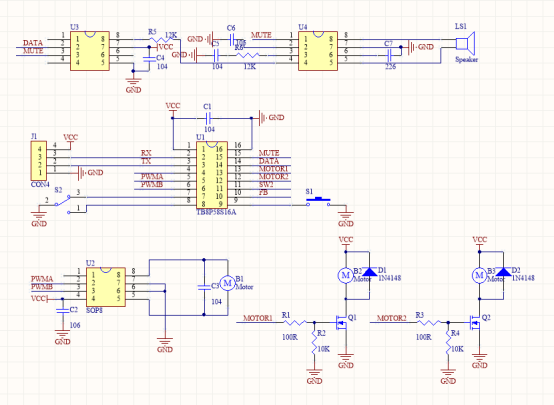 外部供電、一個輕觸開關(guān)、 一個兩檔撥動開關(guān)、三路電機輸出、一路UART通信、一路語音輸出。