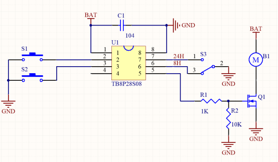 S3在8H下拉時定時8小時后啟動馬達轉(zhuǎn)動,S2短按下拉時停止馬達輸出,休眠;