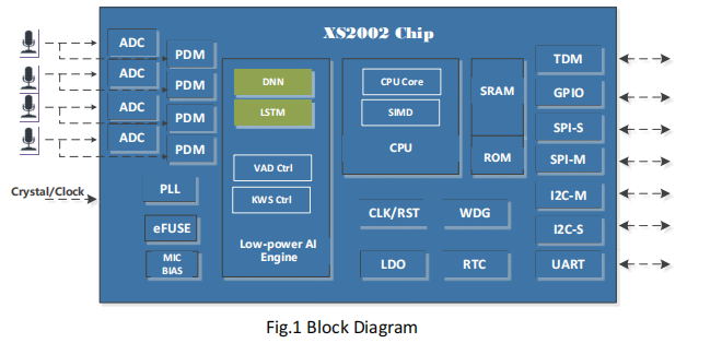 產片介紹:1 功能簡述XS200X 系列是一款專用的支持 AI 算法的音頻 DSP 芯片,兼顧了超低功耗數(shù)據(jù)采樣和高強度計算的兩方面需求。一方面,低功耗芯片技術和人工智能算法支持低功耗信號檢測,檢測功耗可