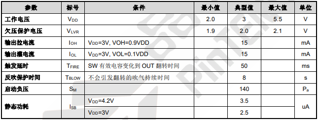 ● 當(dāng)咪頭輸入腳 SW 檢測(cè)到電容變化達(dá)到預(yù)設(shè)值時(shí),OUT 腳將由低電平翻轉(zhuǎn)為高電平。