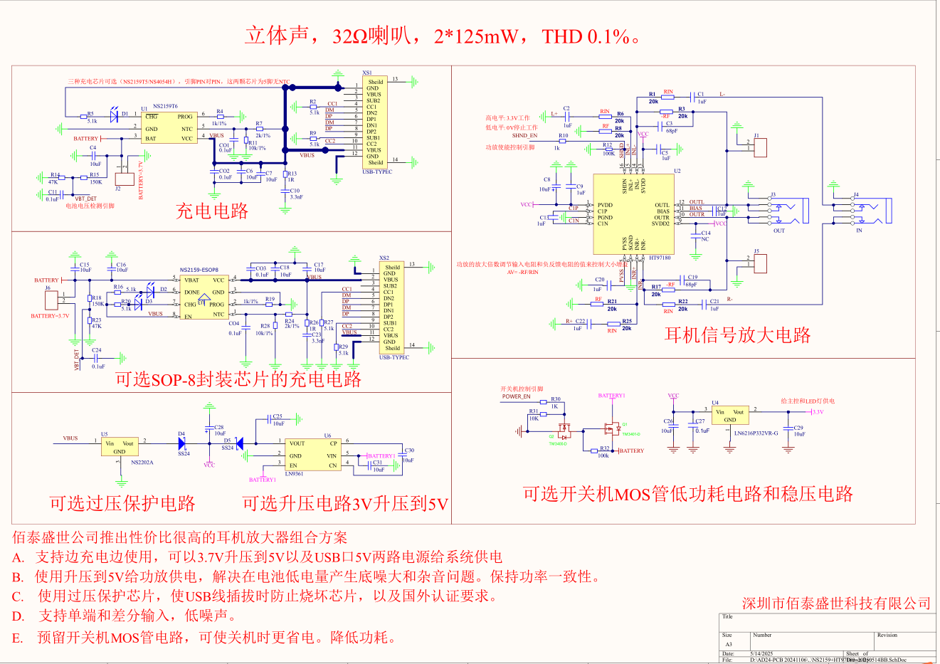 產(chǎn)片介紹:頭戴式耳機組合方案功能: 單節(jié)鋰電池(配置NS2159充電芯片,1A充電電流) 外置升壓芯片(配置LN9361升壓芯片,升壓值5V) 過壓保護(hù)芯片(配置NS2202A過壓芯片,過壓值6V)模擬功放芯片(配置HT97180芯片,供電1 65V-4 8V,最高功