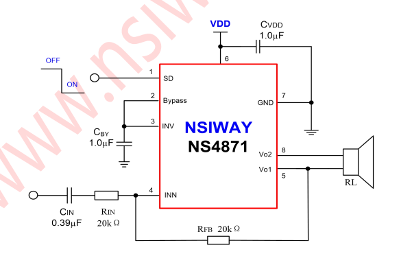 NS4871 可以通過(guò)控制進(jìn)入低功耗關(guān)斷模式,從 而減少功耗。增益帶寬積高達(dá) 2.5MHz 且單位增益穩(wěn)定。通過(guò)配置外圍電阻可以調(diào)整放大器的電壓增益, 方便應(yīng)用。