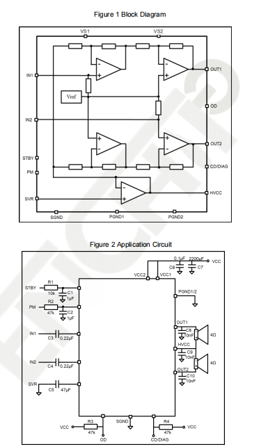 The AXPA47576 is a dual bridge audio Class AB power amplifier with DMOS output power stages. It has