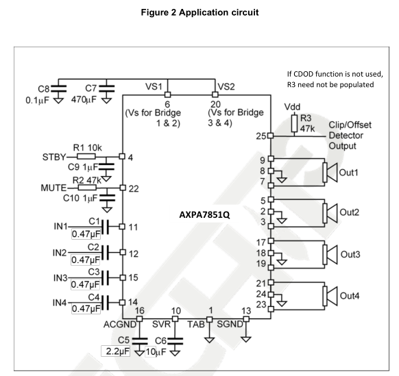 AXPA7851Q is an automotive AEC-Q100 certified quad bridge class AB car radio audio power amplifier