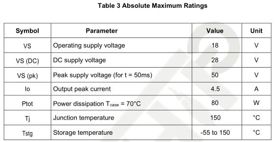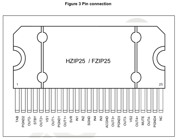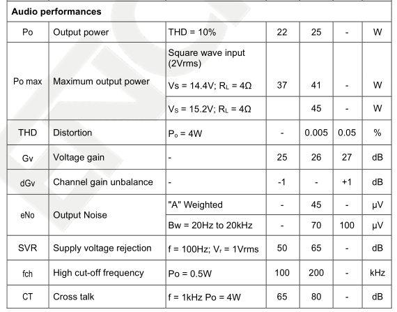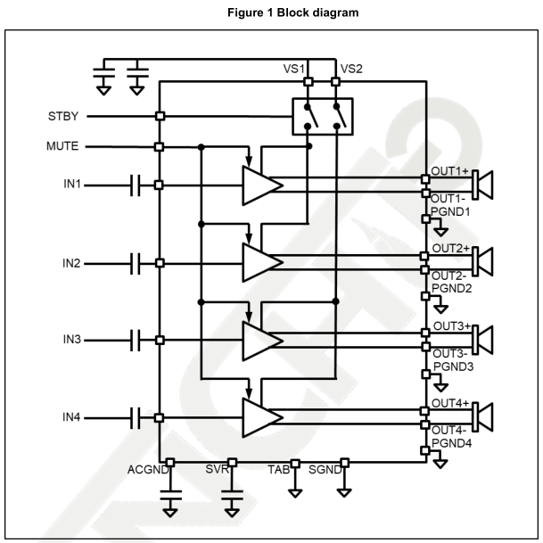 • 4 dependent class AB amplifiers with DMOS Mosfet output stages