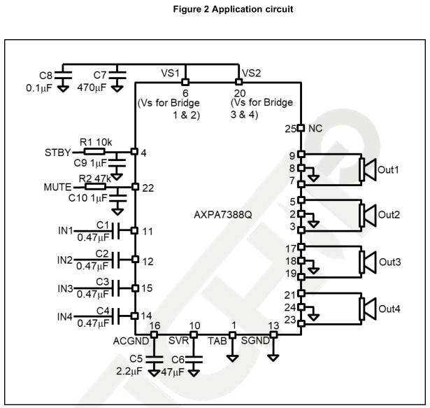 AXPA7388Q is an automotive AEC-Q100 certified quad bridge class AB car radio audio power amplifier
