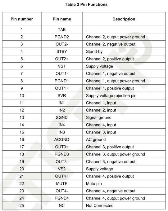 – 4 x 25W/4Ω @ 14.4V, 1kHz, 10%