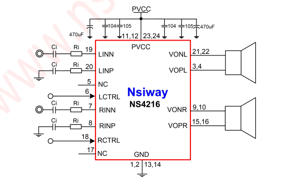 產(chǎn)片介紹:NS4216 是一款差分輸入,超低 EMI,無(wú)需濾波器,20W(10W×2)雙聲道 D 類音頻功率放大器。芯片有兩個(gè)控制端分別控制芯片的左右聲道,可通過(guò)高低電平控制芯片的工作模式:LCTRL RCTRL腳電壓為高電平時(shí),芯片的 L R 通道進(jìn)入工作模式,低電平時(shí)芯片關(guān)斷,應(yīng)用靈活方便。