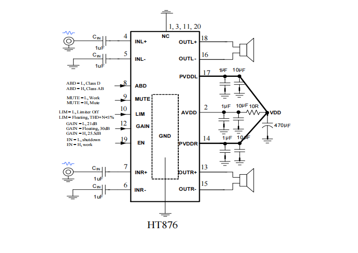 產(chǎn)品名稱:HT876 帶任意限幅的10.9Wx2高保真音頻功放