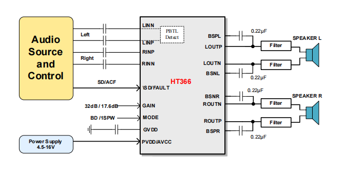 HT366是一款高效D類音頻功率放大器。在14V供電的立體聲(BTL)模式、THD+N=10%條件下,能夠持續(xù)提供2*20W/49功率輸出:在單聲道(PBTL)、模式、THD+N=10%條件下,能夠持續(xù)提供34W/4Q功率輸出。