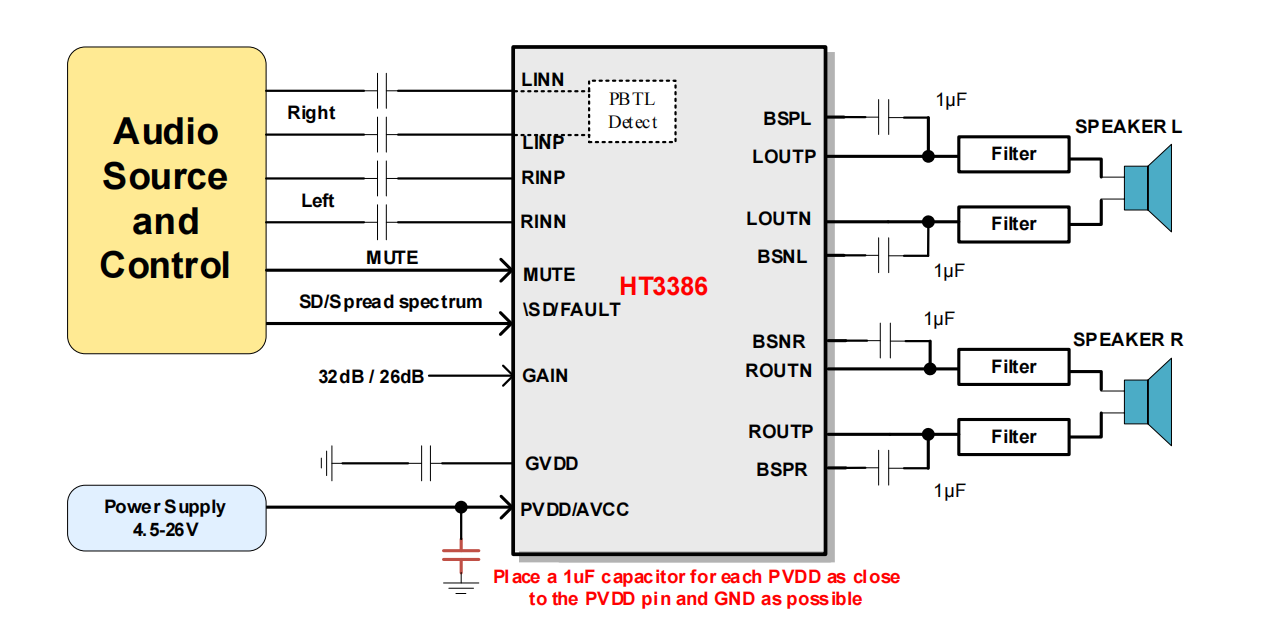 此外,HT3386內(nèi)置關(guān)斷功能使待機(jī)電流最小化,同時(shí)內(nèi)置了MUTE功能,還集成了過壓保 護(hù)、直流保護(hù)、短路保護(hù)、熱保護(hù)和電源欠壓 異常保護(hù)等功能,可全面防止出現(xiàn)故障。