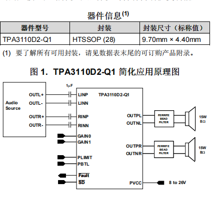 TPA3110D2-Q1 可以驅動低至 4Ω 的立體聲揚聲器。 該器件具有 90% 的高效率,播放音樂時無需外部散熱 器。 輸出受到完全的保護以防止到 GND,VCC 和輸出到輸 出的短接。短路保護和熱保護均含有自動恢復功能。