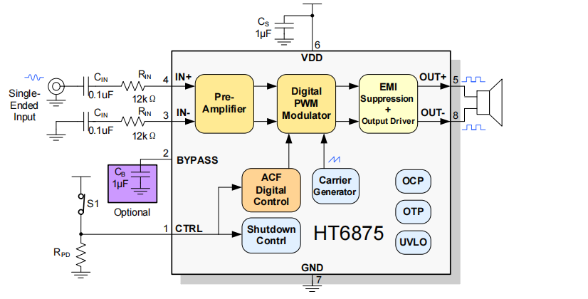 HT6875是一款低EMI的,防削頂失真的,單聲道免濾波D類音頻功率放大器。在5V電源,10%THD+N,4Ω負(fù)載條件下,輸出2.8W功率,在 各類音頻終端應(yīng)用中維持高效率并提供AB類 放大器的性能。
