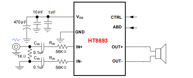 HT8693可實現(xiàn)AB類和D類的自由切換功能,在受到D類功放EMI干擾困擾時,可隨時切換至AB類音頻功放模式。
