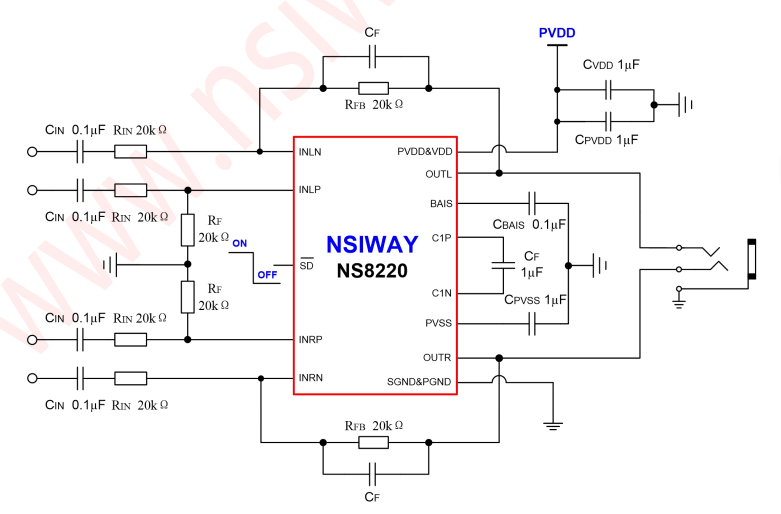 NS8220 是一款差分/單端輸入,輸出無(wú)需隔直電容,能直接輸出驅(qū)動(dòng)的耳機(jī)放大器??蛻艨梢酝ㄟ^(guò)外置輸入電阻和反饋電阻靈活設(shè)置增益。