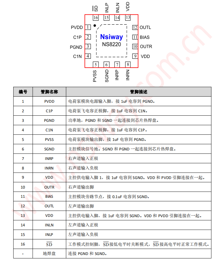 NS8220-QFN3X3X0.75-16L 的管腳圖如下圖所示: