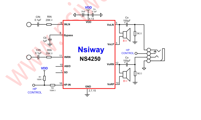 產(chǎn)品名稱:NS4250 3.0Wx2 雙聲道 AB/D 類雙模音頻功率放大器附加耳機模式