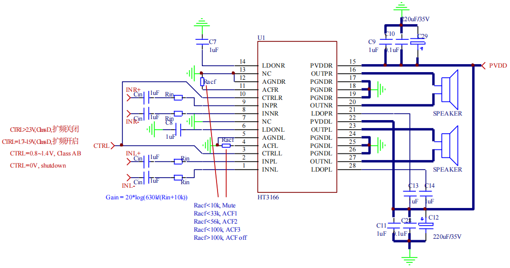 HT3166具有防削頂失真(ACF)輸出控制功能,可檢測(cè)并抑制由于輸入音樂(lè)、語(yǔ)音信號(hào)