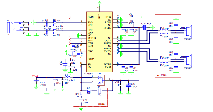 此外,HTA8998內(nèi)部集成免濾波器調(diào)制技術(shù), 能夠直接驅(qū)動(dòng)揚(yáng)聲器,內(nèi)置的關(guān)斷功能使待機(jī)電流最小化,還集成了輸出端過(guò)流保護(hù)、片內(nèi)過(guò)溫保護(hù)、輸入電源欠壓異常保護(hù)、升壓電壓過(guò)壓保護(hù)等功能。