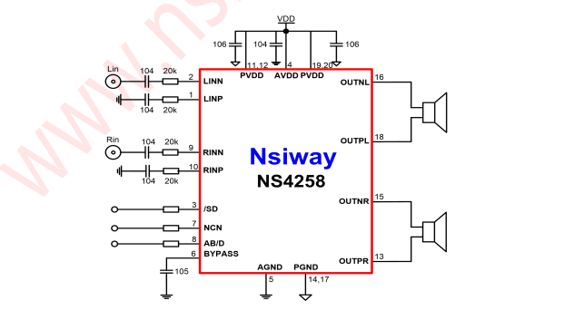 產(chǎn)品名稱:NS4258 5.0Wx2 雙聲道 AB/D 類雙模音頻功率放大器附加 NCN 模式